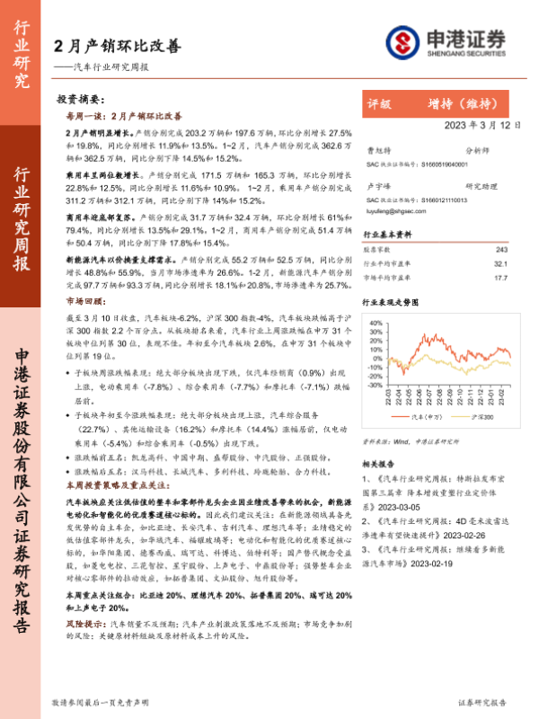 【申港证券】【20230312】2月产销环比改善——汽车行业研究周报-15页