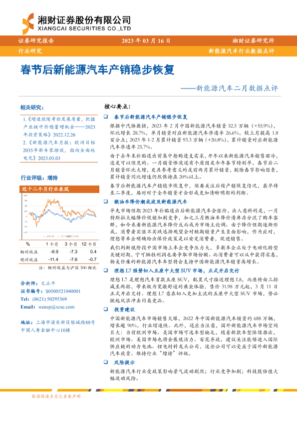 【湘财证券】【20230316】春节后新能源汽车产销稳步恢复——新能源汽车二月数据点评-18页