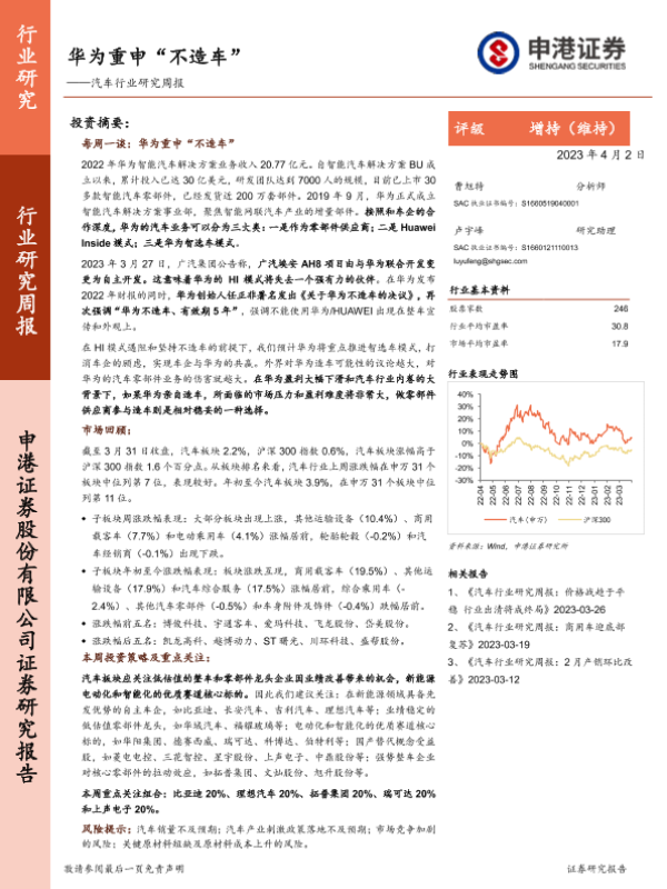 【申港证券】【20230402】20230402-申港证券-汽车行业研究周报:华为重申“不造车”-14页