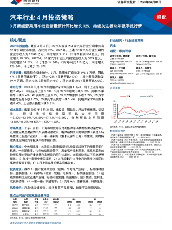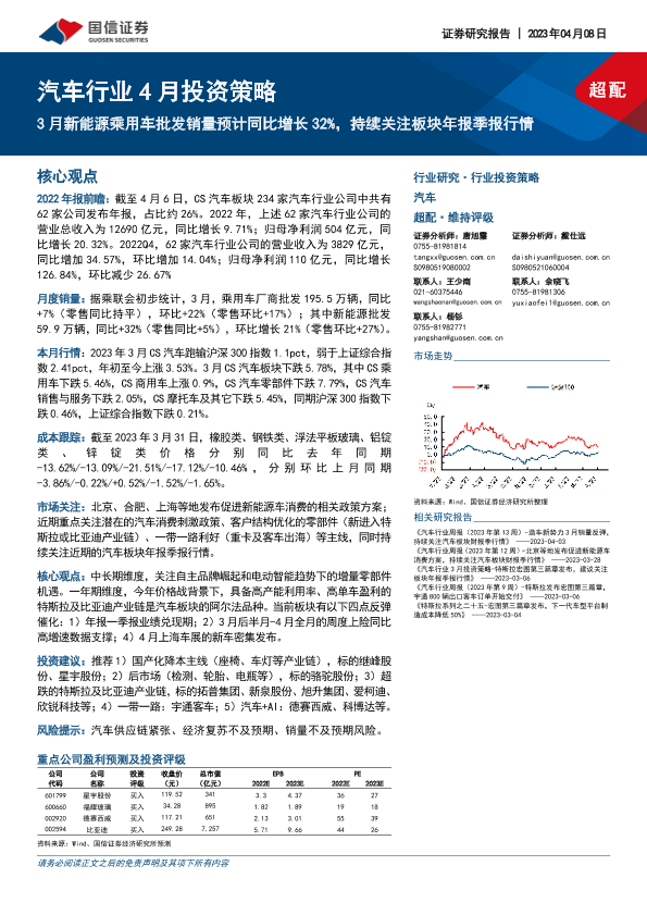 【国信证券】【20230408】汽车行业4月投资策略:3月新能源乘用车批发销量预计同比增长32%,持续关注板块年报季报行情-43页