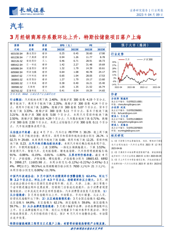 【长城证券】【20230409】20230409-长城证券-汽车行业周报:3月经销商库存系数环比上升,特斯拉储能项目落户上海-27页