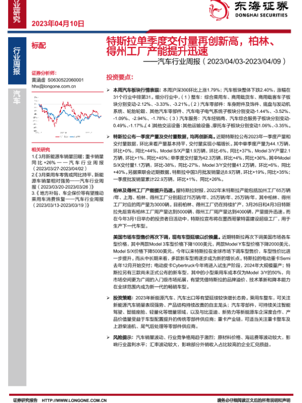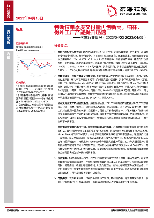 【东海证券】【20230410】20230410-东海证券-汽车行业周报:特斯拉单季度交付量再创新高,柏林、得州工厂产能提升迅速-14页
