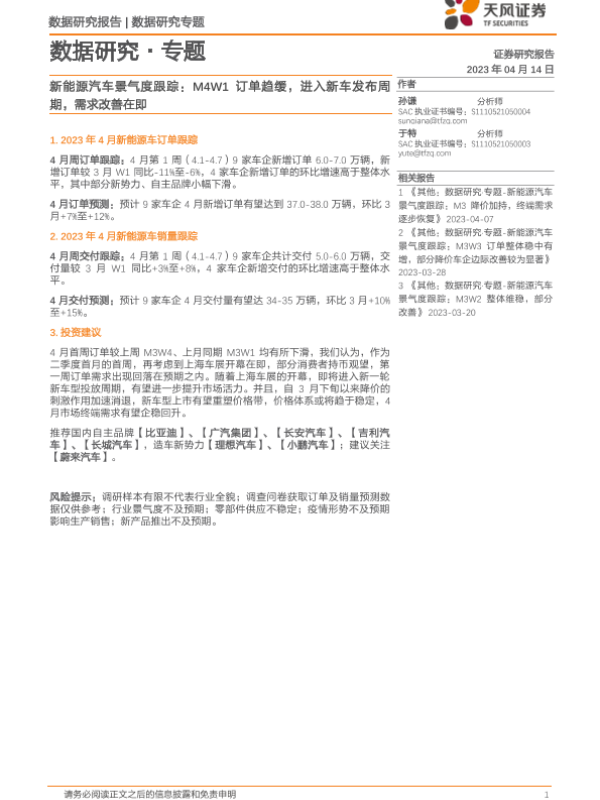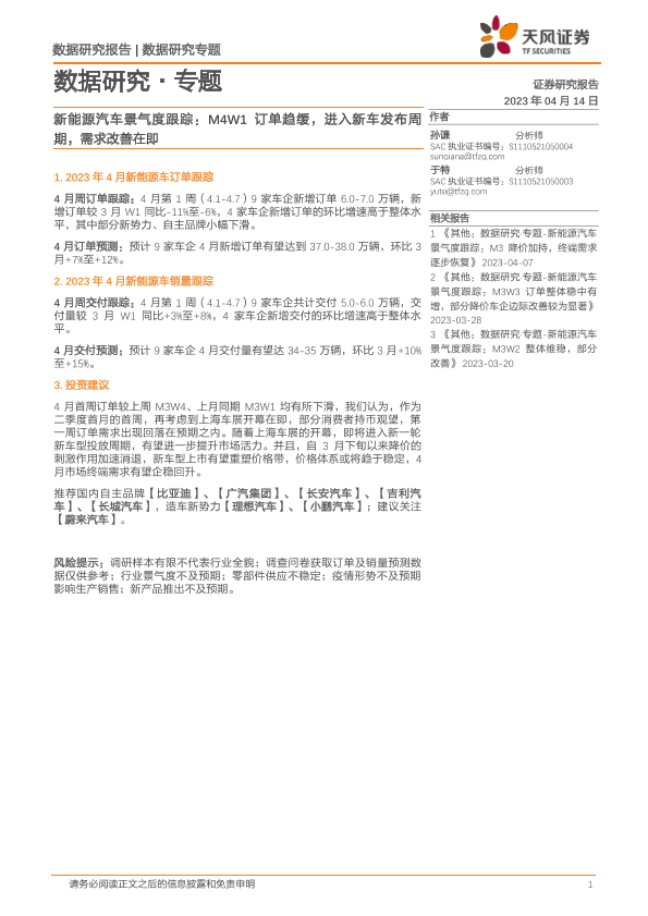 【天风证券】【20230414】20230414-天风证券-新能源汽车景气度跟踪:M4W1订单趋缓,进入新车发布周期,需求改善在即-10页