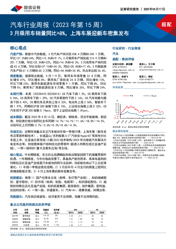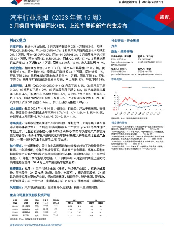 【国信证券】【20230417】汽车行业周报(2023年第15周):3月乘用车销量同比+8%,上海车展迎新车密集发布-39页