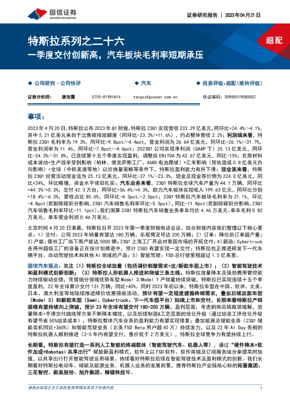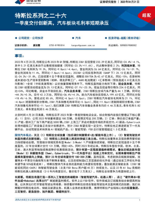 【国信证券】【20230421】特斯拉系列之二十六:一季度交付创新高,汽车板块毛利率短期承压-13页