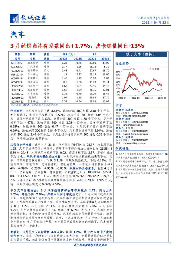 【长城证券】【20230423】20230423-长城证券-汽车行业周报:3月经销商库存系数同比+1.7%,皮卡销量同比-13%-29页