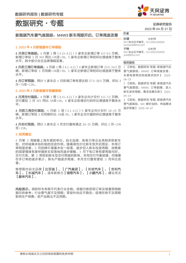 【天风证券】【20230427】20230427-天风证券-新能源汽车景气度跟踪:M4W3新车周期开启,订单周度改善-10页