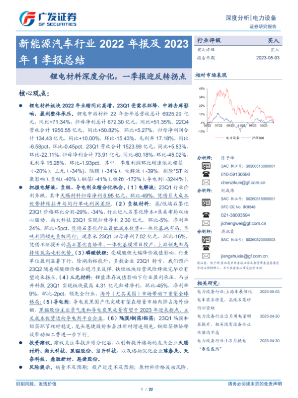 【广发证券】【20230503】新能源汽车行业2022年报及2023年1季报总结:锂电材料深度分化,一季报迎反转拐点-22页