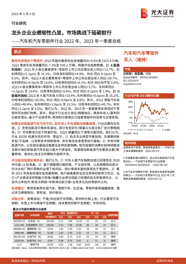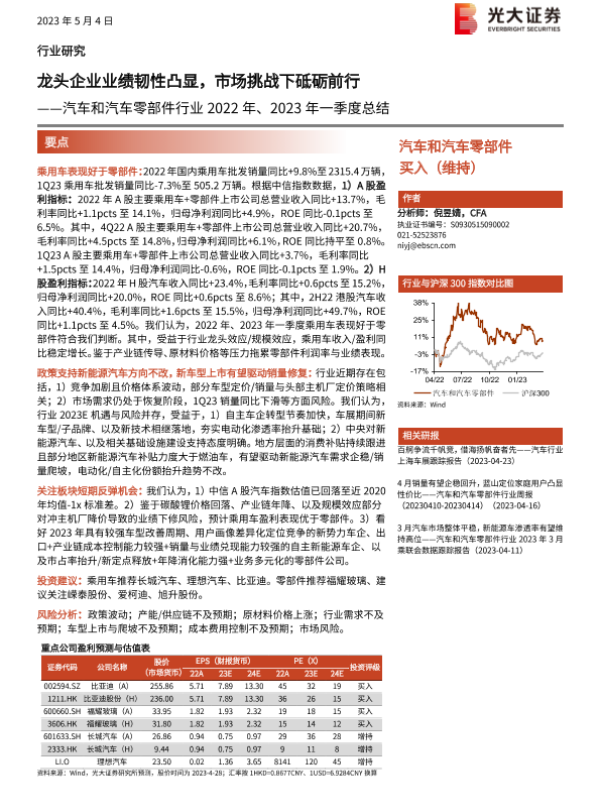 【光大证券】【20230504】汽车和汽车零部件行业2022年、2023年一季度总结:龙头企业业绩韧性凸显,市场挑战下砥砺前行-13页