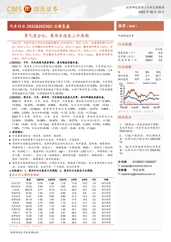 【海通证券】【20230512】汽车行业2022&2023Q1业绩复盘:景气度分化,商用车迎来上升周期-13页