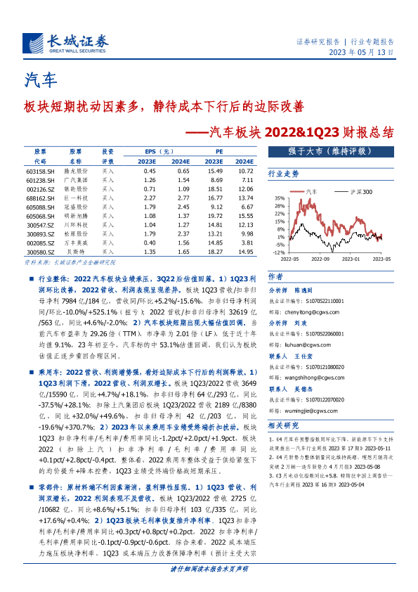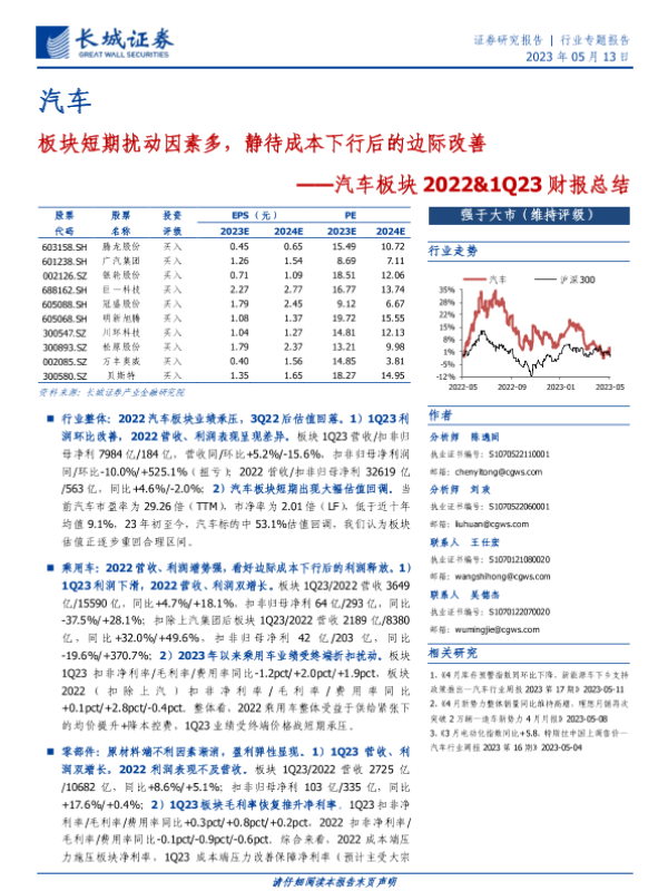 【长城证券】【20230513】汽车板块2022&1Q23财报总结:板块短期扰动因素多,静待成本下行后的边际改善-36页
