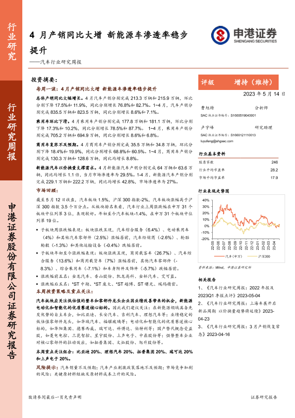 【申港证券】【20230514】4月产销同比大增 新能源车渗透率稳步提升-16页