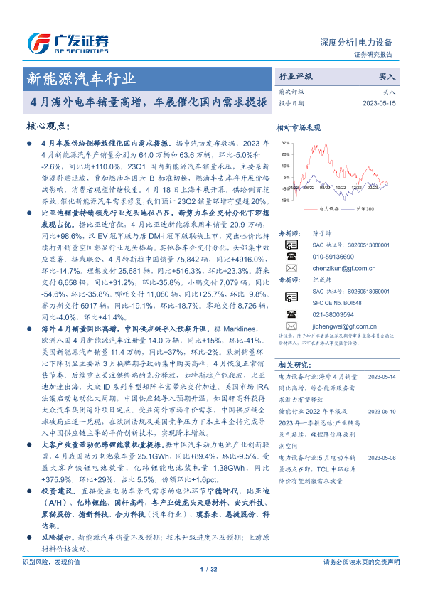 【广发证券】【20230515】20230515-广发证券-新能源汽车行业深度分析:4月海外电车销量高增,车展催化国内需求提振-32页