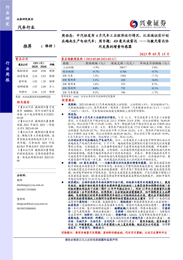 【兴业证券】【20230515】汽车行业周动态:中汽协发布4月汽车工业经济运行情况、比亚迪证实计划在越南生产电动汽车;周专题:4D毫米波雷达,与激光雷达协同发展的增量传感器-32页