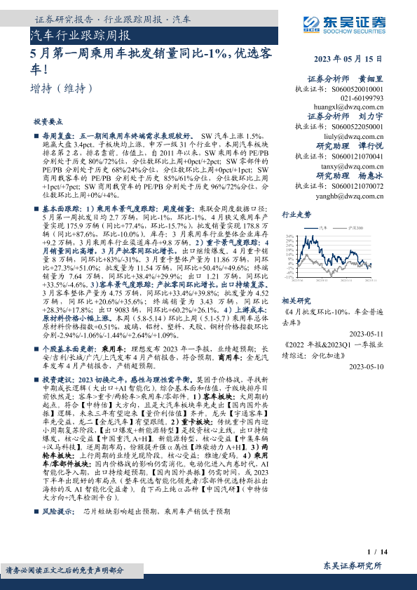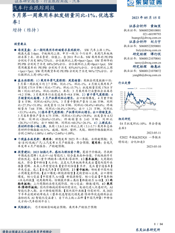 【东吴证券】【20230515】20230515-东吴证券-汽车行业跟踪周报:5月第一周乘用车批发销量同比-1%,优选客车!-14页