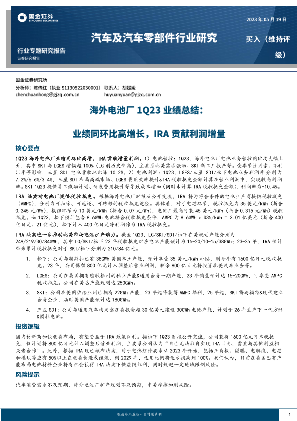 【国金证券】【20230519】汽车及汽车零部件行业研究:海外电池厂1Q23业绩总结-业绩同环比高增长,IRA贡献利润增量-12页