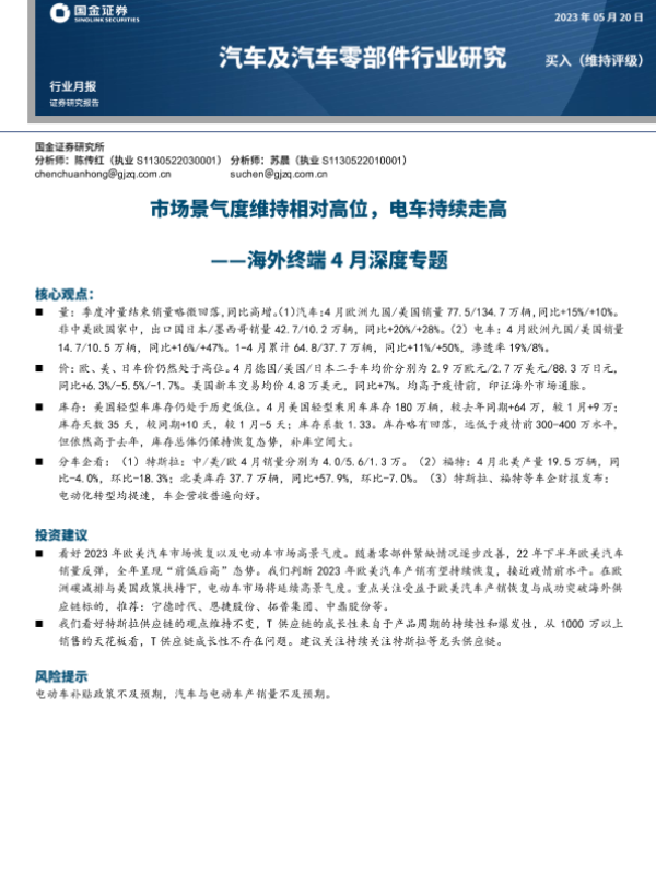 【国金证券】【20230520】汽车及汽车零部件行业研究:海外终端4月深度专题-市场景气度维持相对高位,电车持续走高-19页