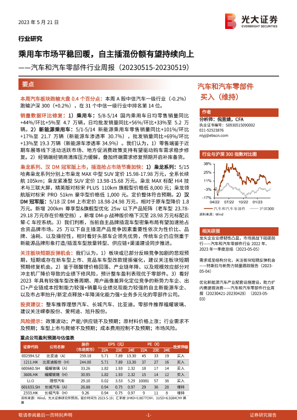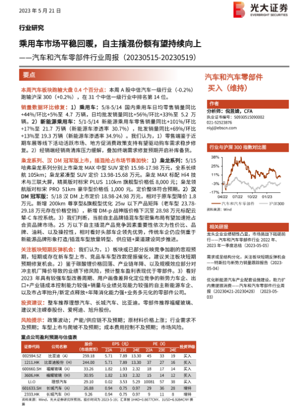 【光大证券】【20230521】汽车和汽车零部件行业周报:乘用车市场平稳回暖,自主插混份额有望持续向上-26页