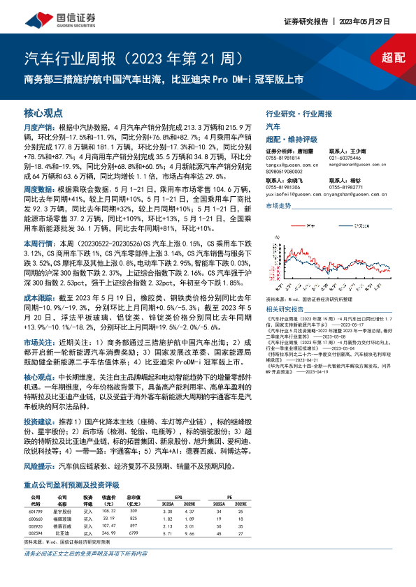 【国信证券】【20230529】汽车行业周报(2023年第21周):商务部三措施护航中国汽车出海,比亚迪宋Pro DM-i冠军版上市-36页
