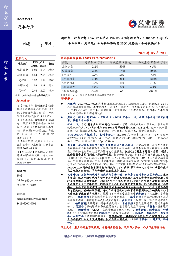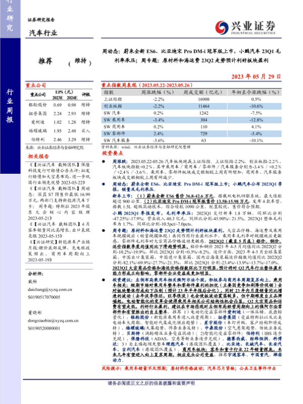 【兴业证券】【20230529】业证券-汽车行业周动态:蔚来全新ES6、比亚迪宋Pro DM-i冠军版上市,小鹏汽车23Q1毛利率承压;周专题:原材料和海运费23Q2走势预计利好板块盈利-31页