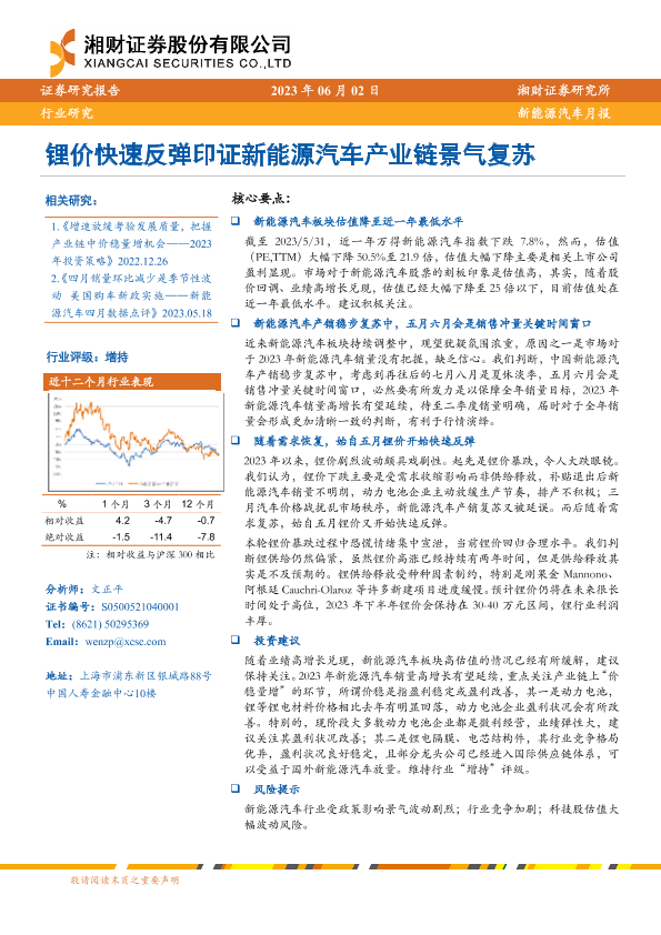 【湘财证券】【20230602】20230602-湘财证券-新能源汽车月报:锂价快速反弹印证新能源汽车产业链景气复苏-14页
