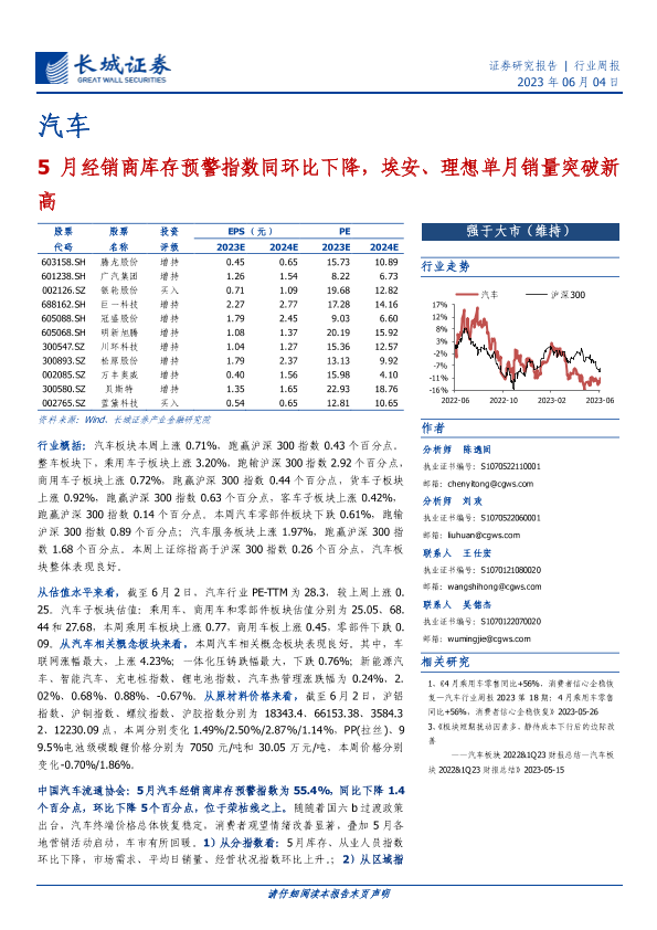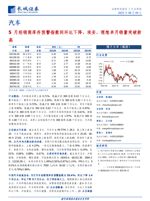 【长城证券】【20230604】20230604-长城证券-汽车行业周报:5月经销商库存预警指数同环比下降,埃安、理想单月销量突破新高-12页