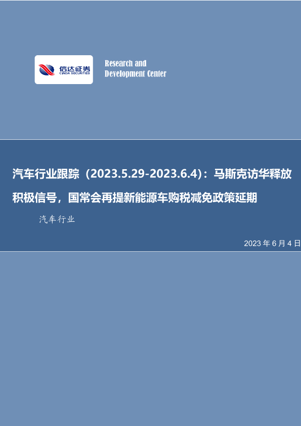 【信达证券】【20230604】20230604-信达证券-汽车行业跟踪:马斯克访华释放积极信号,国常会再提新能源车购税减免政策延期-20页