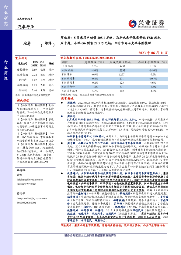 【兴业证券】【20230611】611-兴业证券-汽车行业周动态:5月乘用车销售205.1万辆,马斯克表示愿意开放FSD授权 周专题:小鹏G6预售22.5万元起,细分市场与竞品车型梳理-19页