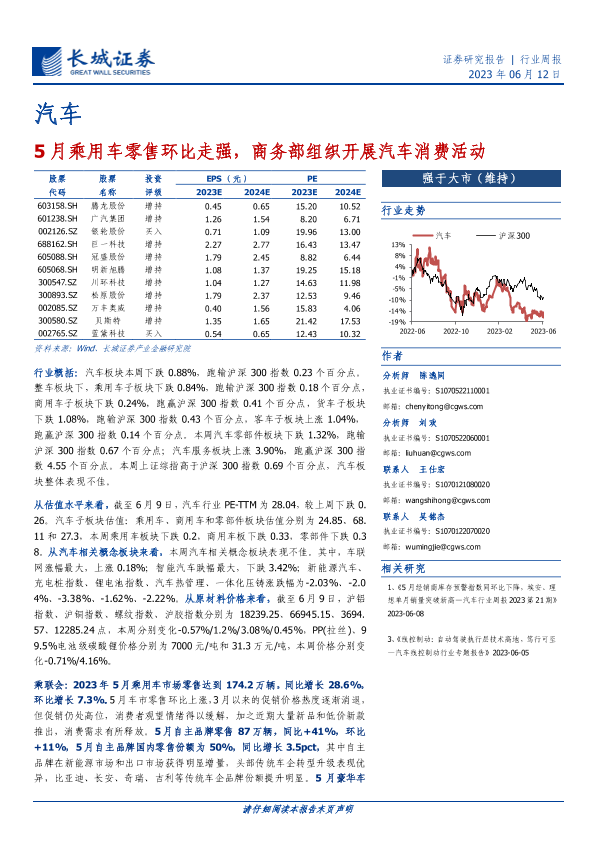 【长城证券】【20230612】20230612-长城证券-汽车行业周报:5月乘用车零售环比走强,商务部组织开展汽车消费活动-12页
