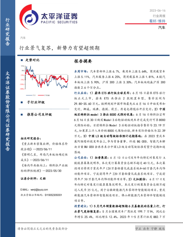 【太平洋证券】【20230616】20230616-太平洋-汽车行业周报:行业景气复苏,新势力有望超预期-20页