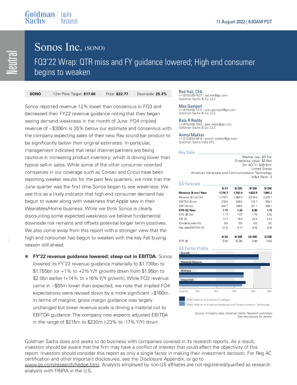 【Goldman Sachs】【20220811】SONO QTR miss and FY guidance lowered; High end consumer begins to weaken-9页