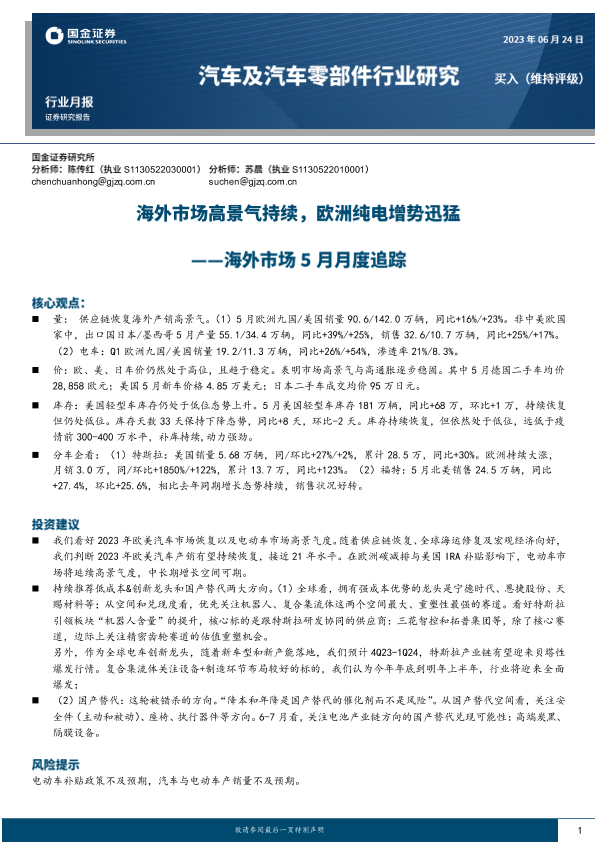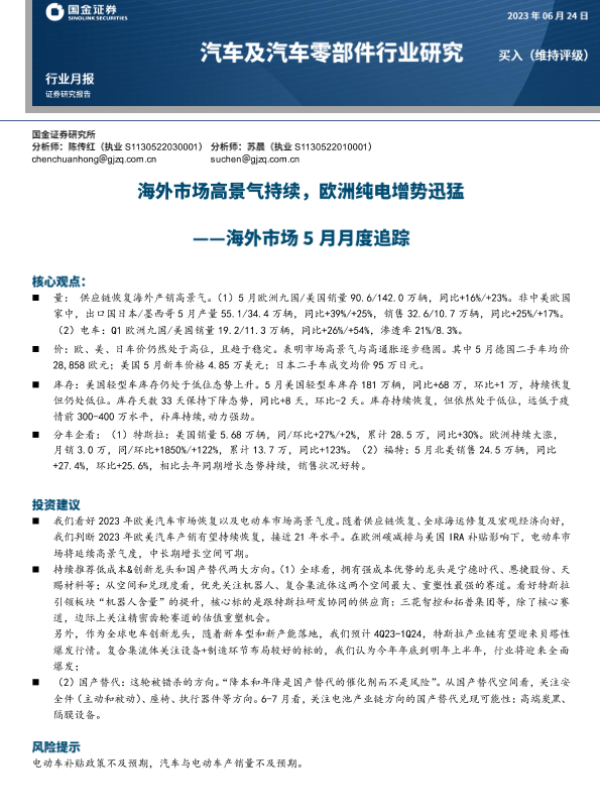 【国金证券】【20230624】汽车及汽车零部件行业研究:海外市场5月月度追踪-海外市场高景气持续,欧洲纯电增势迅猛-15页