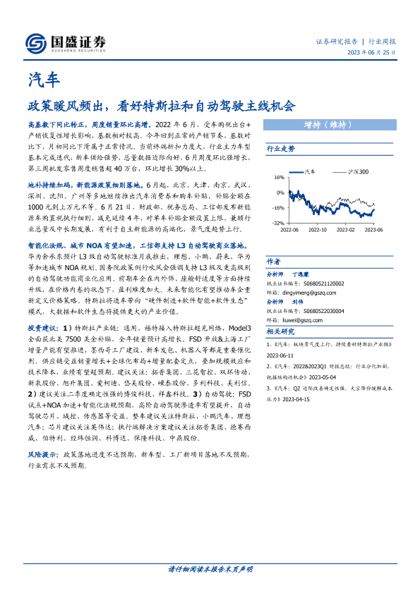 【国盛证券】【20230625】20230625-国盛证券-汽车行业周报:政策暖风频出,看好特斯拉和自动驾驶主线机会-24页
