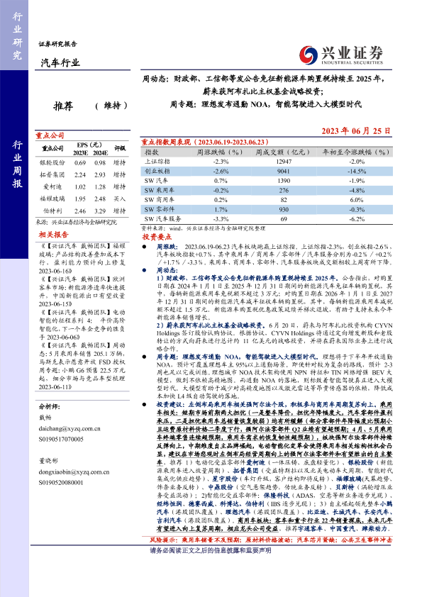【兴业证券】【20230625】汽车周动态:财政部、工信部等发公告免征新能源车购置税持续至2025年,蔚来获阿布扎比主权基金战略投资;周专题:理想发布通勤NOA,智能驾驶进入大模型时代-17页