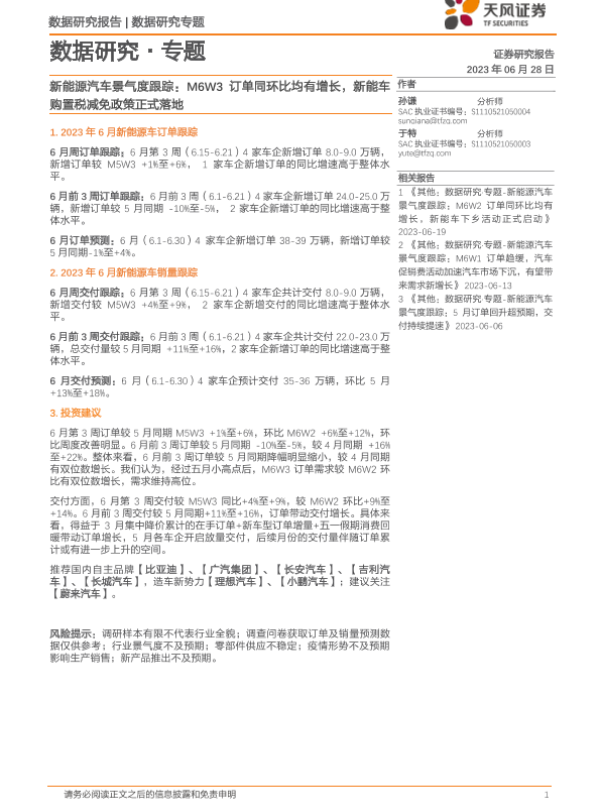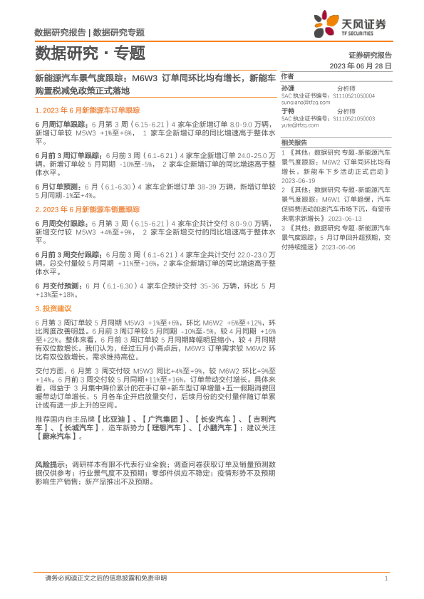 【天风证券】【20230628】新能源汽车景气度跟踪:M6W3订单同环比均有增长,新能车购置税减免政策正式落地-11页