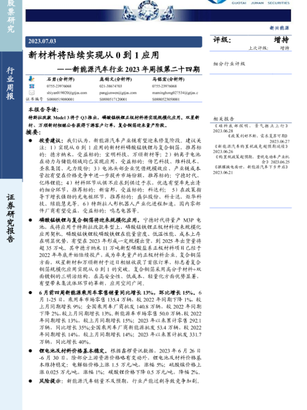 【国泰君安证券】【20230703】新能源汽车行业2023年周报第二十四期:新材料将陆续实现从0到1应用-12页