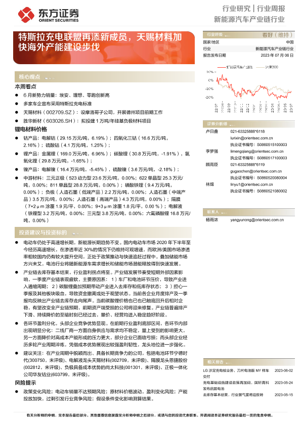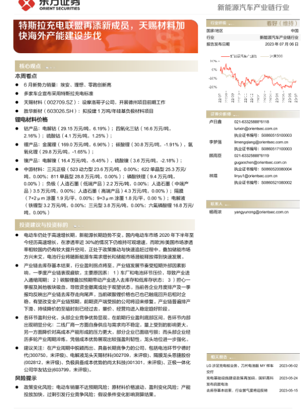 【东方证券】【20230706】20230706-东方证券-新能源汽车产业链行业周报:特斯拉充电联盟再添新成员,天赐材料加快海外产能建设步伐-14页