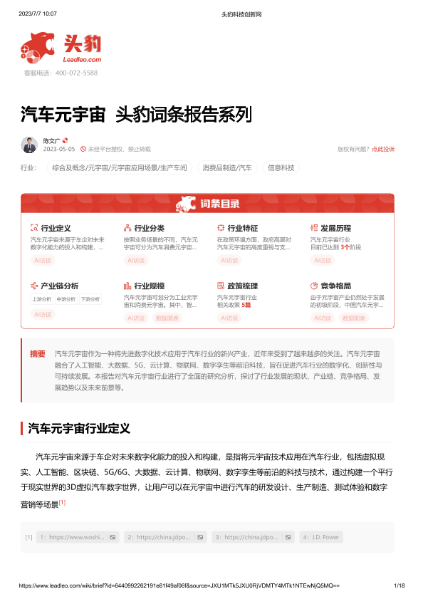 【头豹研究院】【20230707】汽车元宇宙 头豹词条报告系列-18页