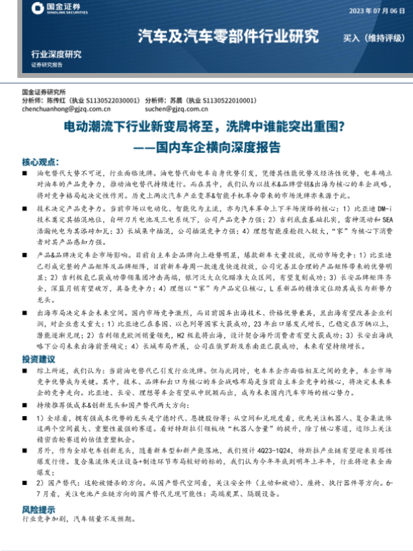 【国金证券】【20230706】汽车及汽车零部件行业研究:国内车企横向深度报告-电动潮流下行业新变局将至,洗牌中谁能突出重围?-43页