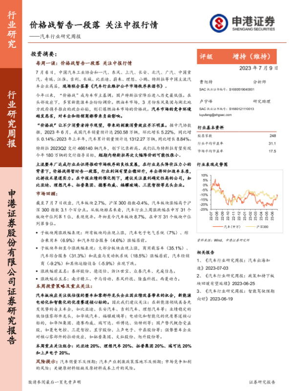 【申港证券】【20230709】20230709-申港证券-汽车行业研究周报:价格战暂告一段落 关注中报行情-14页