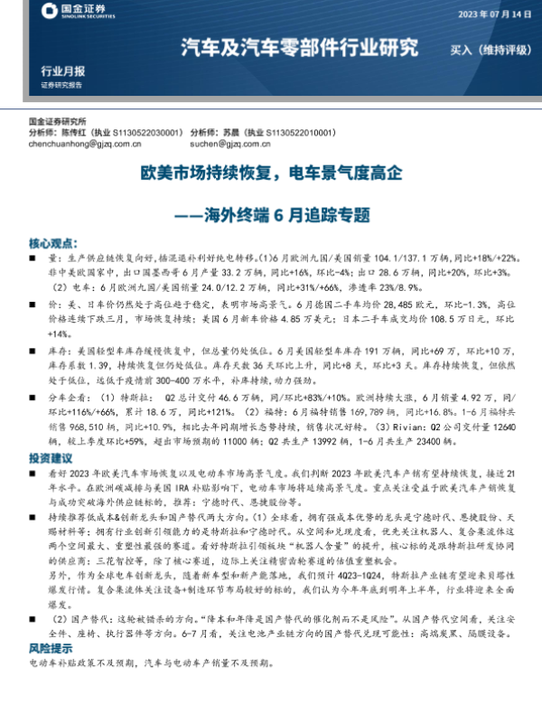 【国金证券】【20230714】20230714-国金证券-汽车及汽车零部件行业研究:海外终端6月追踪专题-欧美市场持续恢复,电车景气度高企-16页