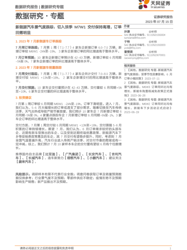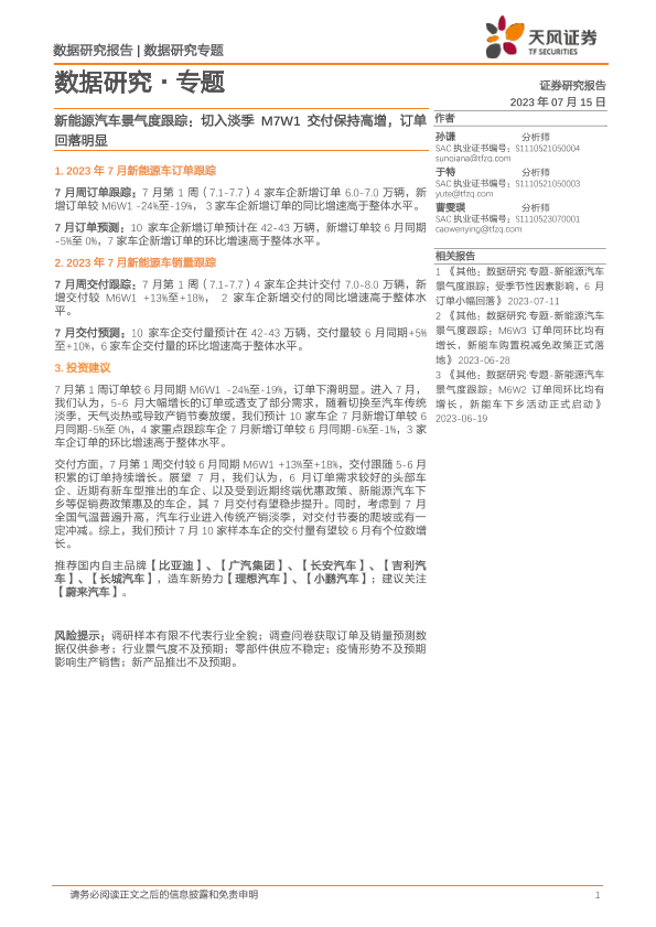 【天风证券】【20230715】新能源汽车景气度跟踪:切入淡季M7W1交付保持高增,订单回落明显-11页
