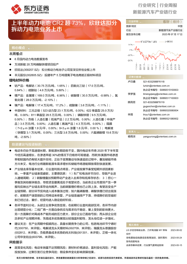 【东方证券】【20230717】20230717-东方证券-新能源汽车产业链行业行业周报:上半年动力电池CR2超73%,欣旺达拟分拆动力电池业务上市-15页