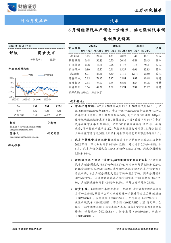 【财信证券】【20230717】20230717-财信证券-汽车行业月度点评:6月新能源汽车产销进一步增长,插电混动汽车销量创历史新高-11页