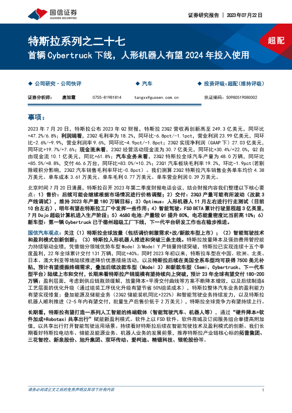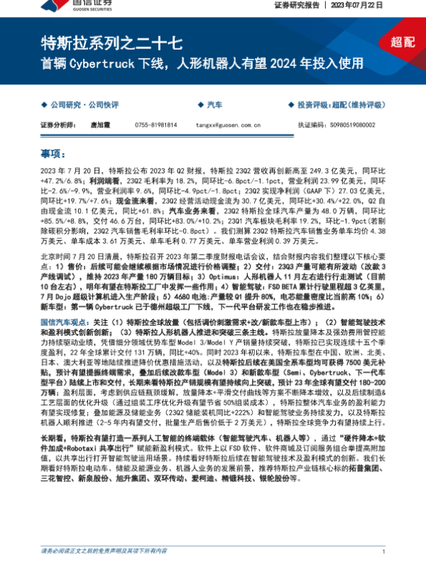 【国信证券】【20230722】特斯拉系列之二十七-首辆Cybertruck下线,人形机器人有望2024年投入使用-13页