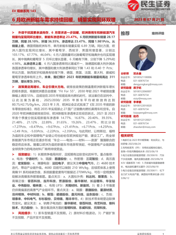 【民生证券】【20230721】EV观察系列143 6月欧洲新能车需求持续回暖,销量实现同环双增-21页