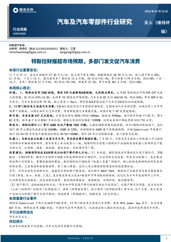 【国金证券】【20230723】汽车及汽车零部件行业研究:特斯拉财报超市场预期,多部门发文促汽车消费-14页