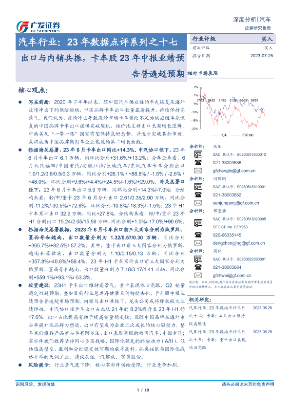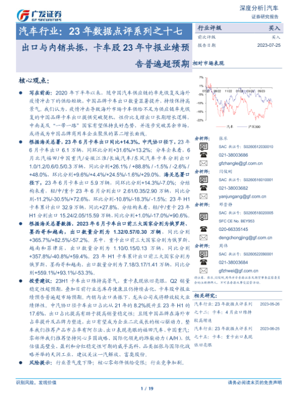 【广发证券】【20230725】汽车行业:23年数据点评系列之十七-出口与内销共振,卡车股23年中报业绩预告普遍超预期-19页