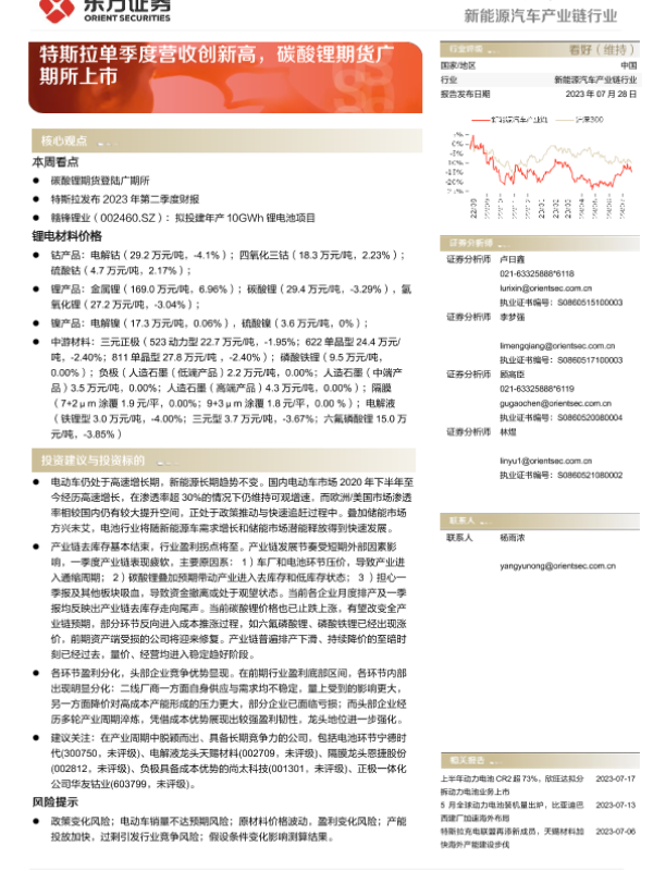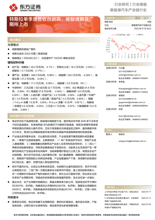 【东方证券】【20230728】20230728-东方证券-新能源汽车产业链行业行业周报:特斯拉单季度营收创新高,碳酸锂期货广期所上市-13页