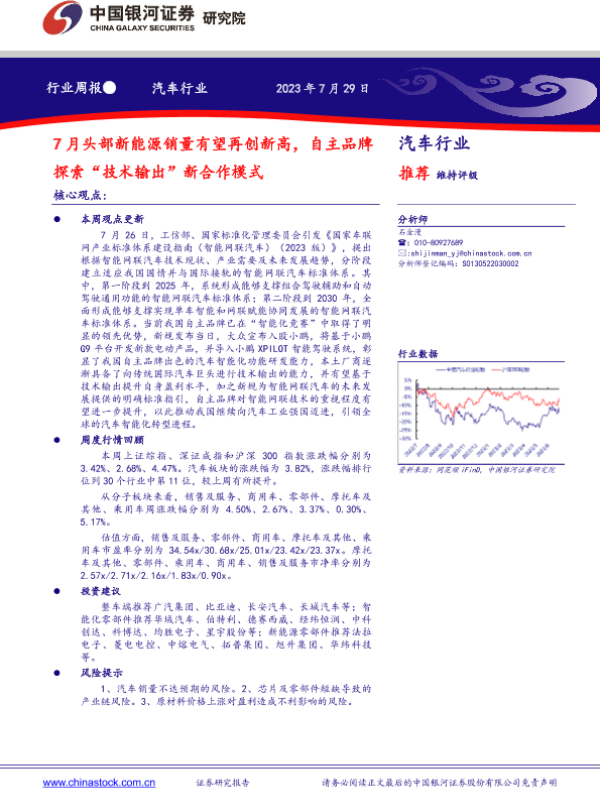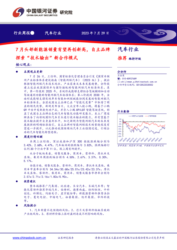 【银河证券】【20230729】20230729-中国银河-汽车行业周报:7月头部新能源销量有望再创新高,自主品牌探索“技术输出”新合作模式-13页